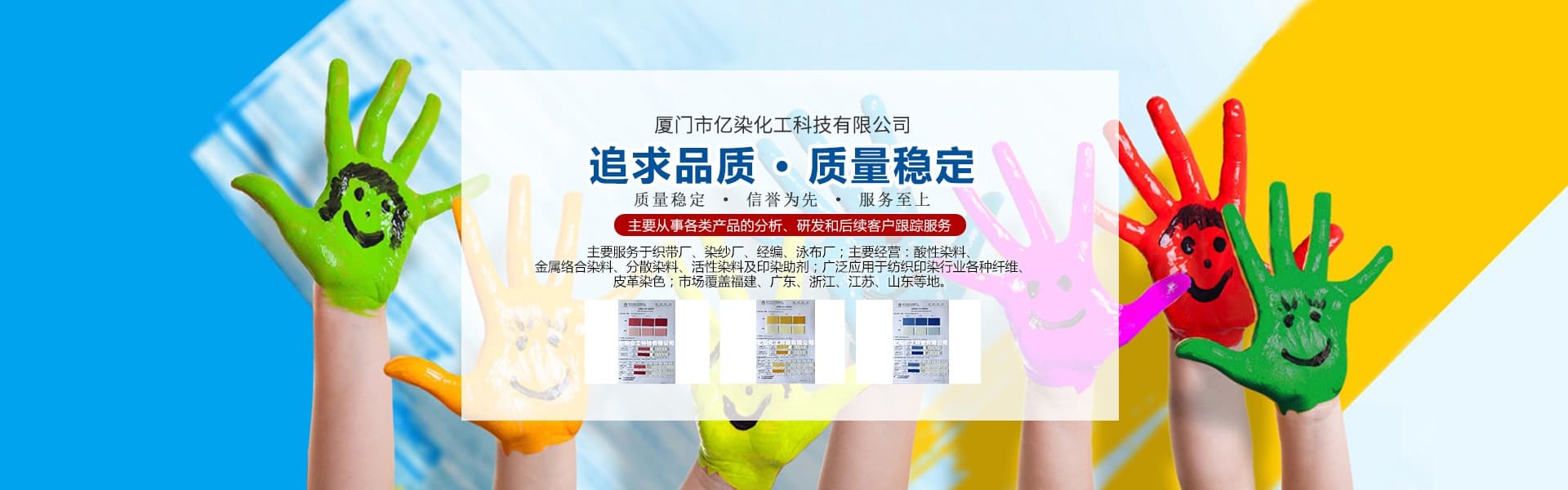 廈門市億染化工科技有限公司是一家集研發、生產、銷售一體的綜合型企業。公司主要經營:酸性染料、金屬絡合染料、高牢度分散染料及印染助劑。公司信守“以誠信贏合作、以質量贏市場、以創新贏發展、以服務贏生存”的企業精神服務于廣大客戶,多年以來建立了良好的市場口碑,市場遍布福建、廣東、浙江、江蘇、山東及東南亞國家,與多家知名企業建立了長期合作伙伴關系!